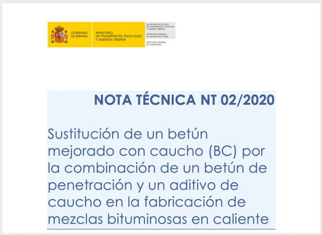 El Ministerio de Transporte, Movilidad y Agenda Urbana ha redactado la NOTA TÉCNICA 02/2020 en la que aprueba el uso de aditivos de caucho pretratados (RARx), en todas aquellas obras en las que en el proyecto se prescriba betunes caucho BC. De esta forma el Ministerio de Transporte, Movilidad y Agenda Urbana se pone…