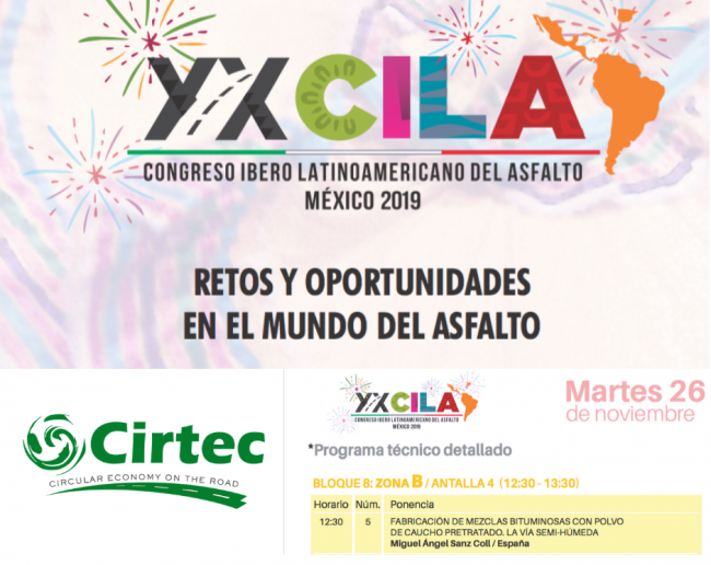 Cirtec participará en el XX CILA 2019 con una ponencia sobre su aditivo con polvo de neumático «RARx» Citec participará en XX Congreso Ibero Latinoamericano 2019 (CILA 2019) con la ponencia «Fabricación de Mezclas Bituminosas con Polvo de Caucho pretratado. La Vía Semi-Húmeda». El Congreso tendrá lugar en la ciudad de Guadalajara, México, durante la semana…